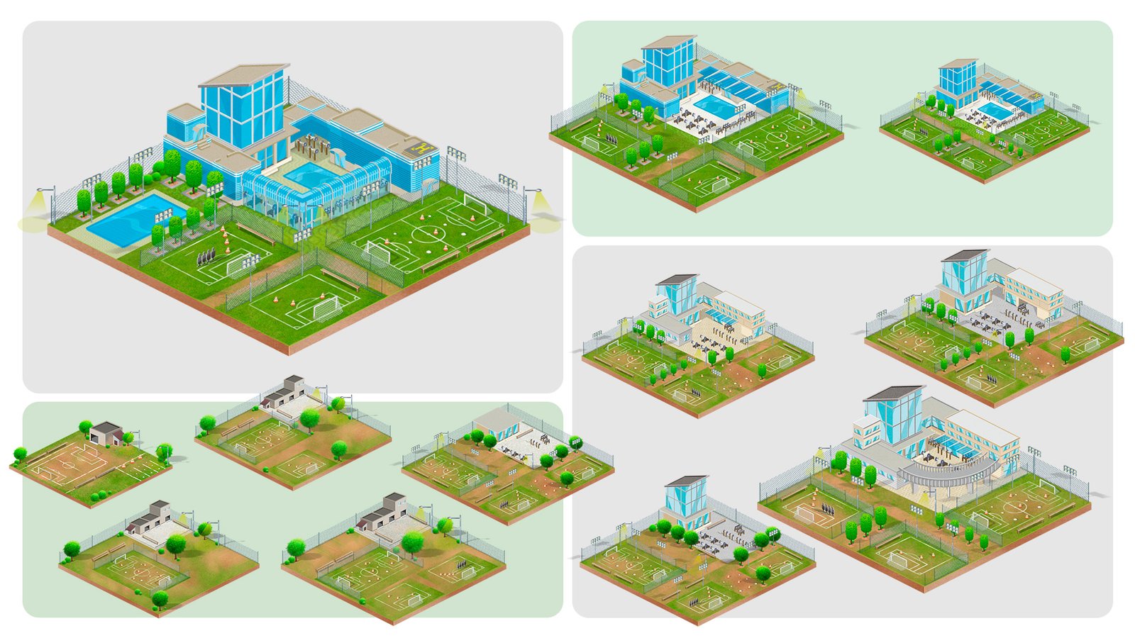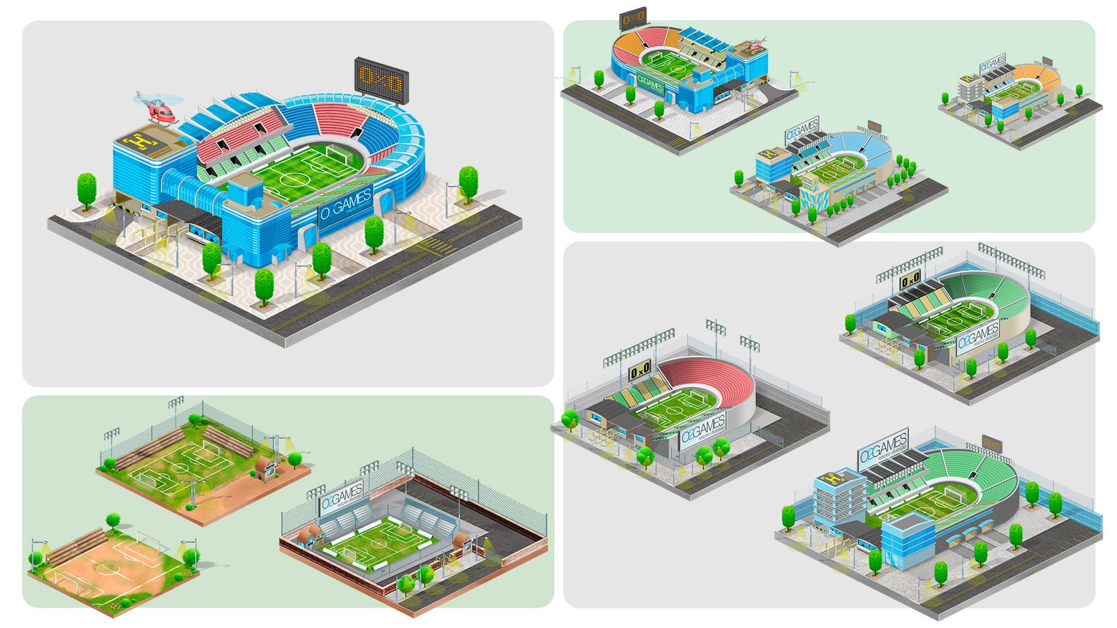 Ilustrações digitais, criadas para um game de futebol, desenvolvidos personagens e estruturas. A arte destaca traços expressivos, que da dinamismo com linhas bem definidas que trazem movimento e peso às composições.