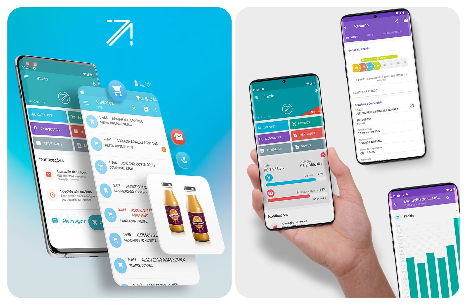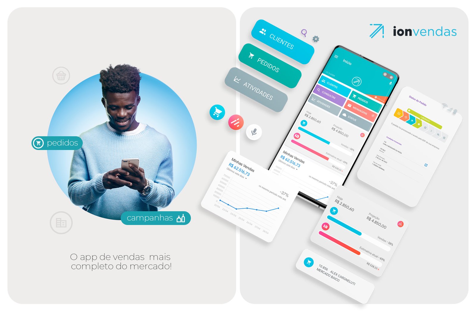Atuei no desenvolvimento do ion Vendas, um aplicativo mobile voltado para atacadistas e distribuidores, com foco nos representantes comerciais autônomos (RCAs). Fui responsável pelo design de interface (UI) e experiência do usuário (UX), criando uma navegação fluida, intuitiva e adaptada às necessidades específicas dos clientes. Além disso, desenvolvi toda a identidade visual do produto — desde a definição de cores, tipografia e ícones até a construção de uma linguagem visual consistente, moderna e funcional.